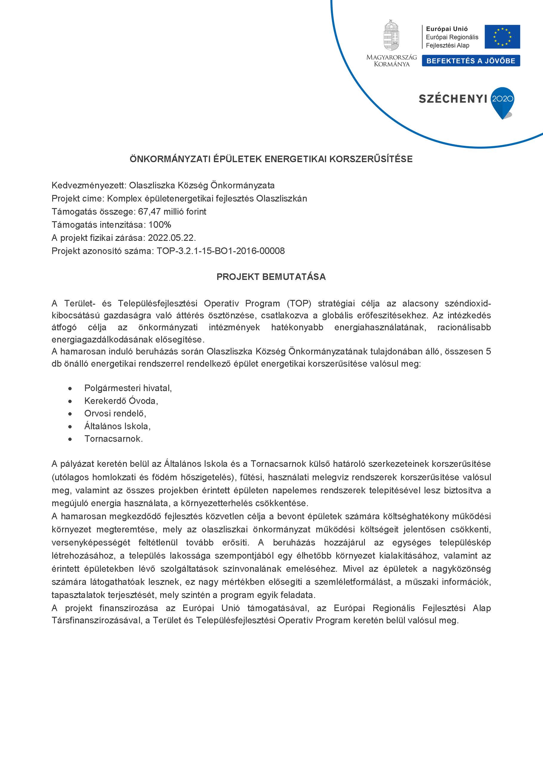 TOP-3.2.1-15-BO1-2016-0008 Komplex épületenergetikai fejlesztés Olaszliszkán